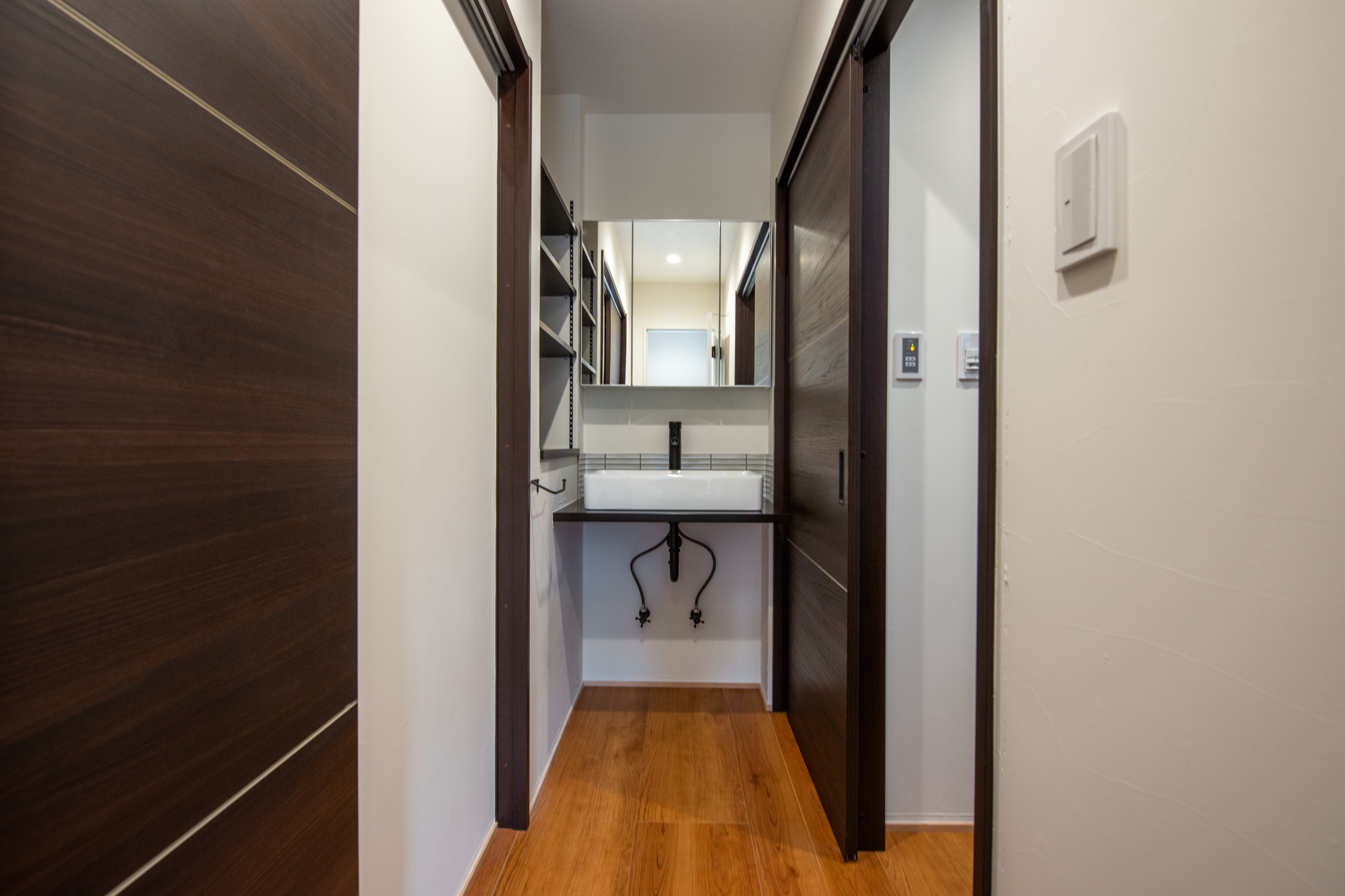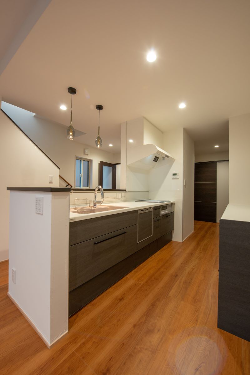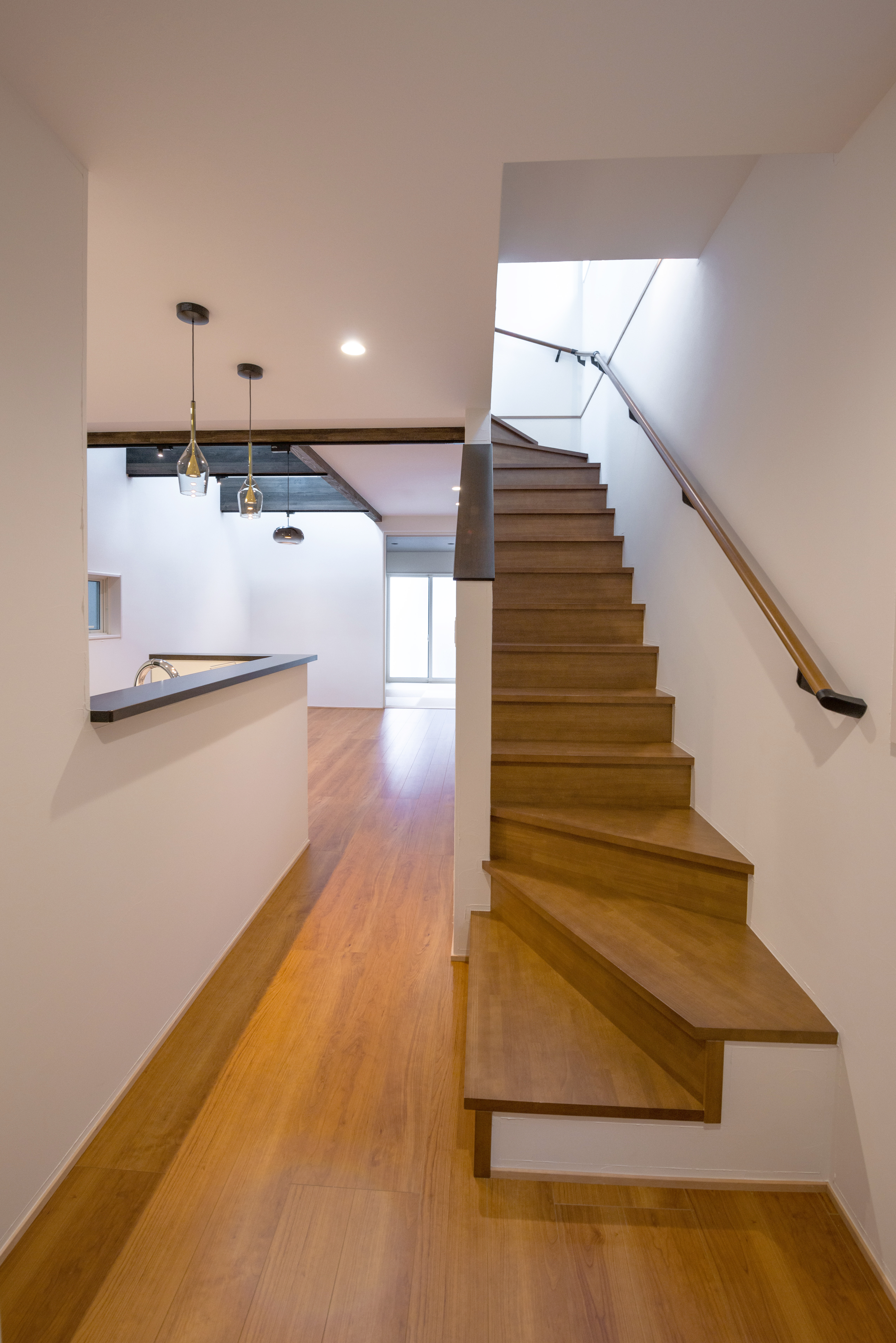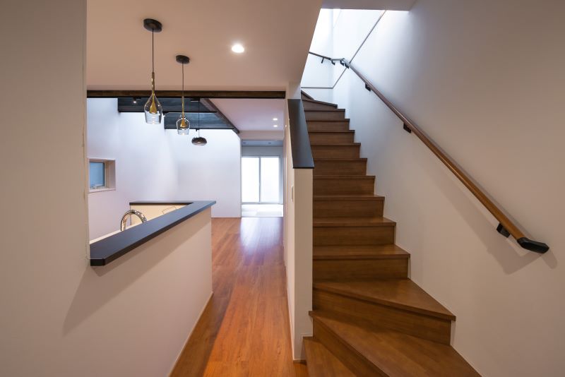 シンプルハイクラス 濃紺のシンプルハウスですが一部に木目の外壁材を使用して単純さを回避。 リビングから吹抜けに繋がる明るさは圧巻です。 間口も広くない敷地ですがあえて「抜け」を取り入れて狭さを感じない間取りとなっております。 その中で畳ルームも取り入れた間取りです。 機能的で使いやすいキッチンの近くに水回りで生活動線もよく、質の高い設備取り入れております。洗面台は印象的でタイル張りのシンクは目を引きます。 もちろん断熱と自然素材にこだわったシンプルハイクラスの家です。 << 前のページに戻る