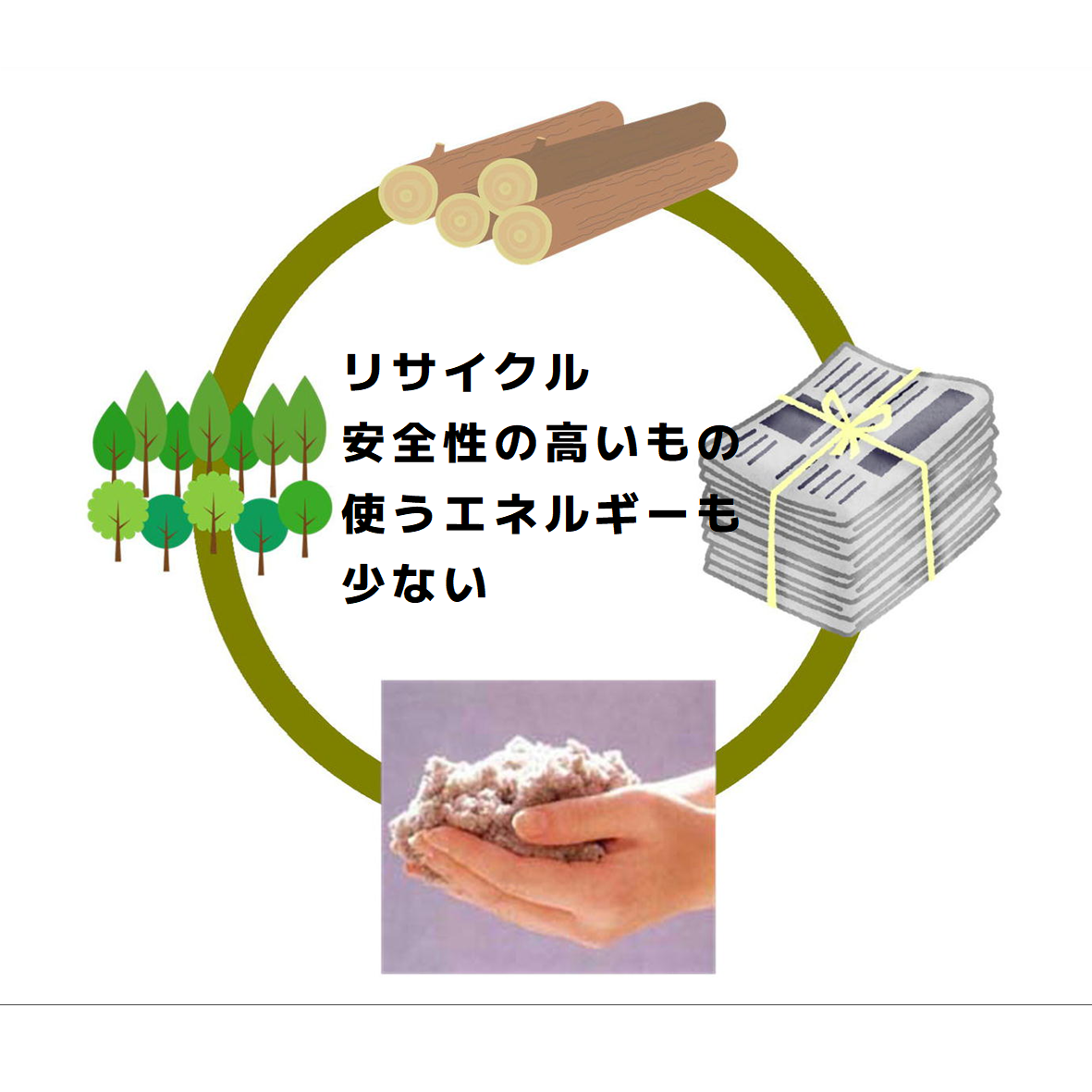 セルロースファイバーは新聞古紙をリサイクルしたものです。印刷に使われているインクも毒性のないものを使用(大豆から作られるインク)しているもの、一度も市場に出てない新聞紙(配られなかった古新聞)のみで製造されたものを使用してます。