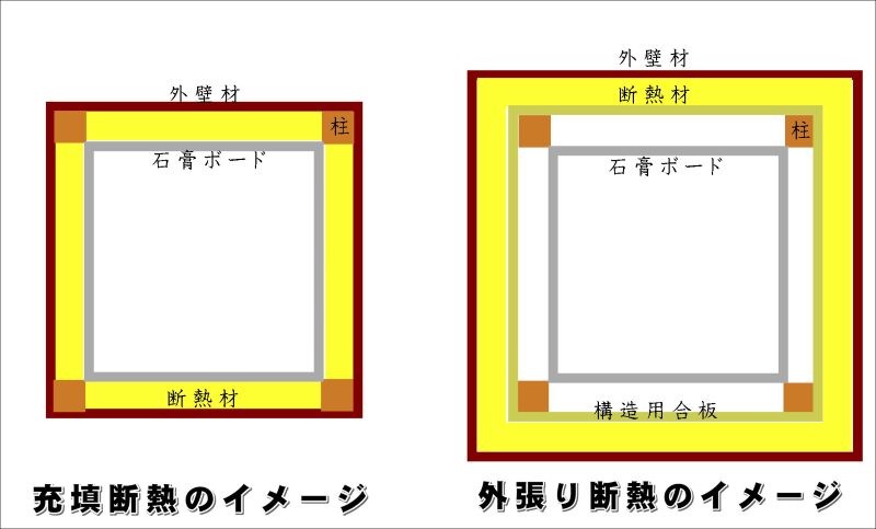 この充填断熱(内断熱)のデメリットを改善するために考えられたのが外張り断熱(外断熱)です。