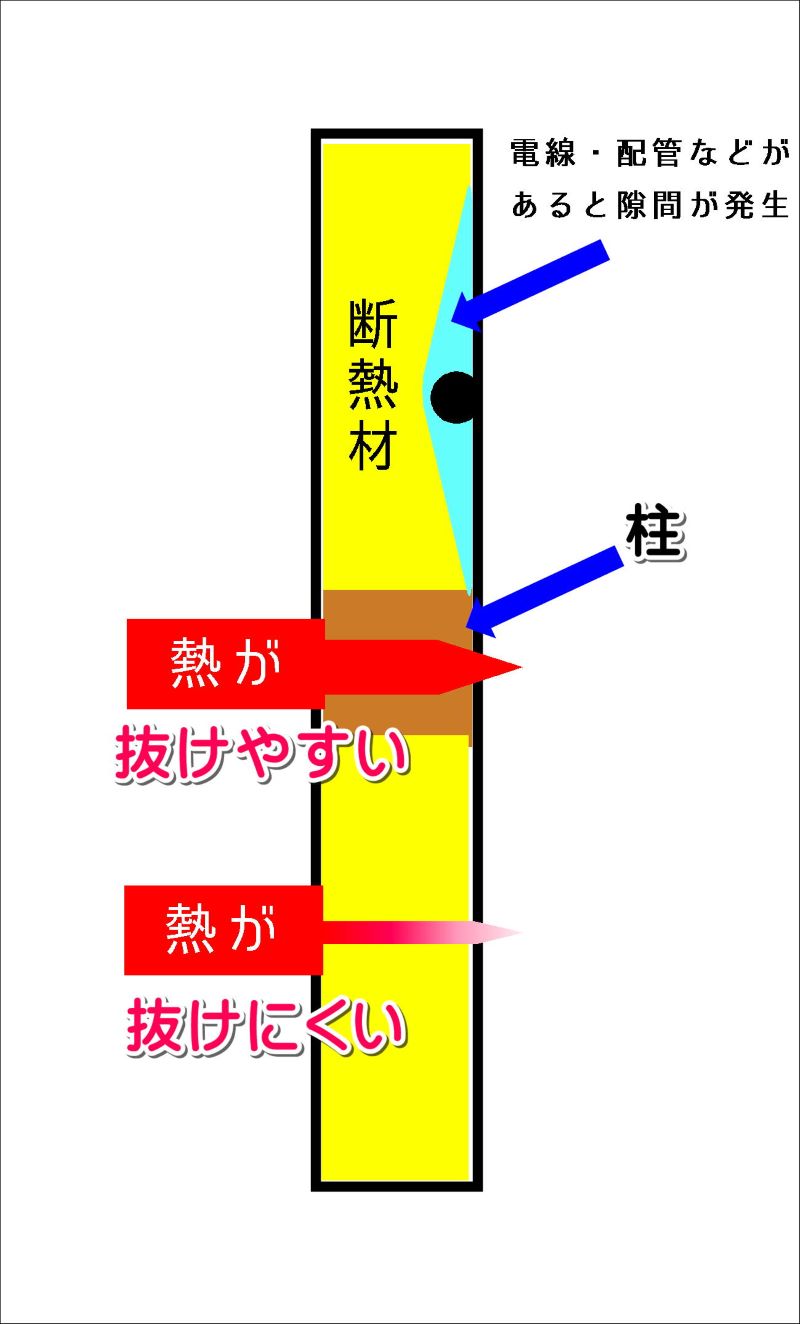 日本の木造住宅はほとんどが、この充填断熱(内断熱)です。壁の中に断熱材を入れるので、間に柱や間柱が入ります。柱や間柱は断熱材よりも断熱性能が低いので断熱のムラが出来てしまいます。そして、断熱性の低い柱や間柱から熱が入り込みます。 現在、日本の住宅はグラスウール断熱材を使用してます。壁の中に配管や電線があるとどうしても隙間ができてしまいます。この隙間があると結露が発生しやすくなります。