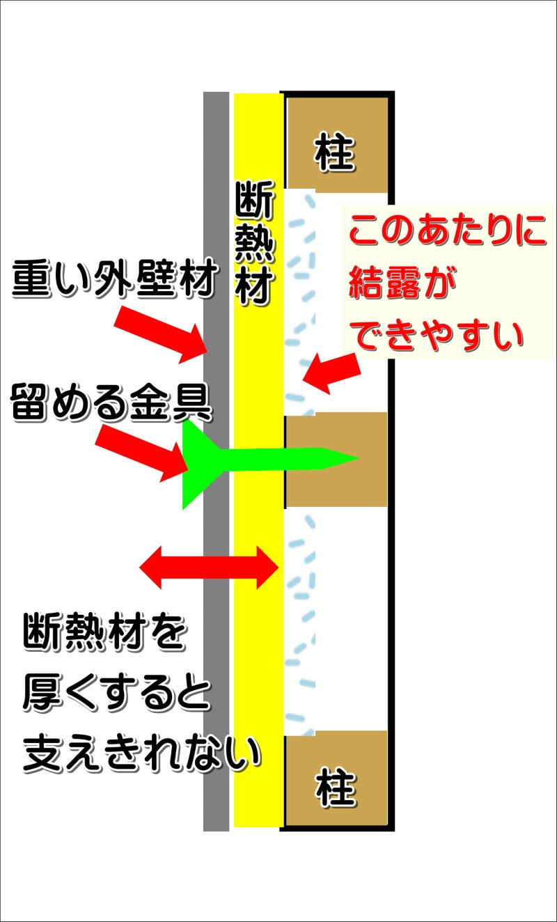建物の外側に断熱材を張っていけば、均一にすっぽりと覆うことができます。これが外張り断熱(外断熱)です。断熱的にはよさそうですが、この断熱材の外側に重い外壁材を張るとなると断熱材の厚みを増やすと留め付ける金具では支えきれなくなります。 分厚いグラスウールなどを入れる場合は重い外壁材を止めるために柱のような木を間に入れていきます。これでは充填断熱(内断熱)と同じように断続的な断熱となってしまいます。外張り断熱(外断熱) のメリットである均一な断熱が失われてしまいます。 また、壁の中が空間となるので外壁側の内側に結露が起こりやすくなります。そこで何か対策をしないと「壁内結露」が発生してしまいます。