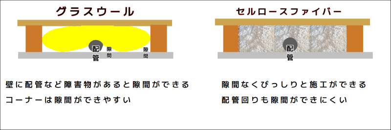 セルロースファイバー断熱材の場合もわずかな隙間に入り振動を止めます、プラス自体の気泡でも振動を止めるので防音、吸音の効果がかなり違うのです。