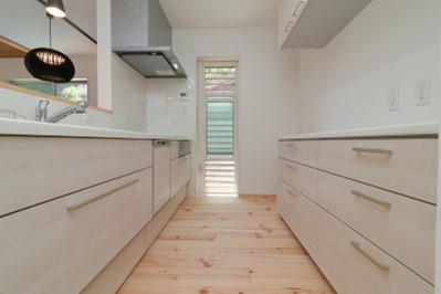勝手口からは明るい陽射しが入り、気持ちよく料理ができるような空間を叶えました。