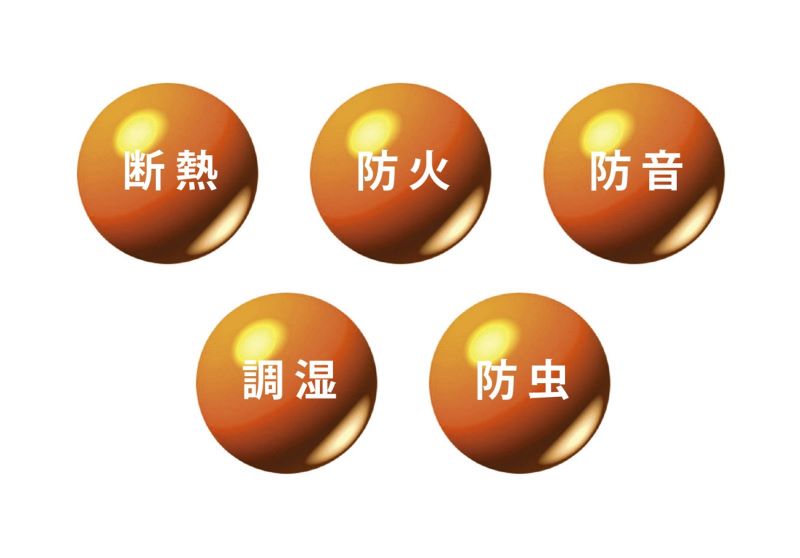 木質繊維の持つ本来の性質による「調湿」・「壁内結露防止」効果、含有されたホウ素系薬剤による「防火」・「防虫」効果、