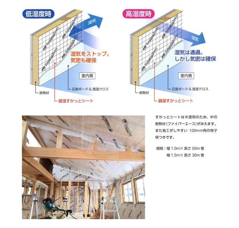 低湿度環境時、防湿機能が働き室内から壁内への湿気の移動を妨げ内部結露(冬型結露)を防止します。