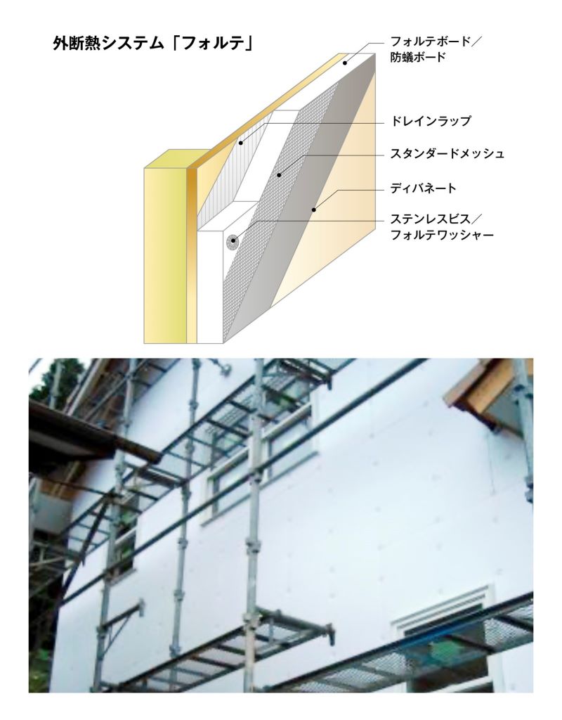 オーパスの外断熱システム「フォルテ」は外壁塗り下地材と断熱材を一体化した外壁材のフォルテボードに、
